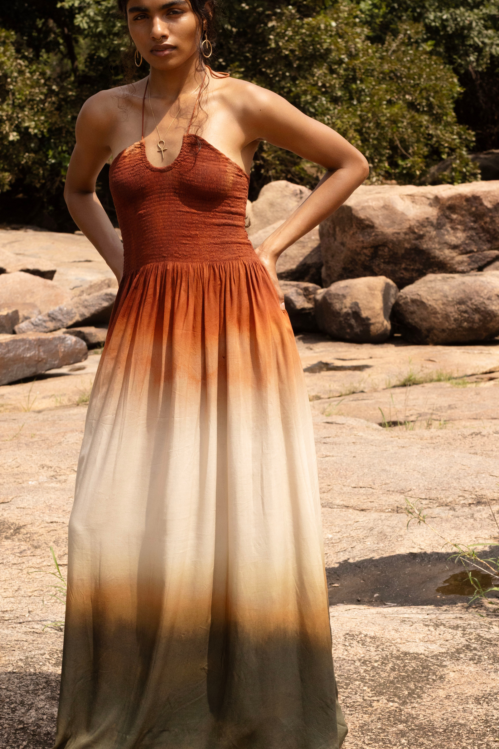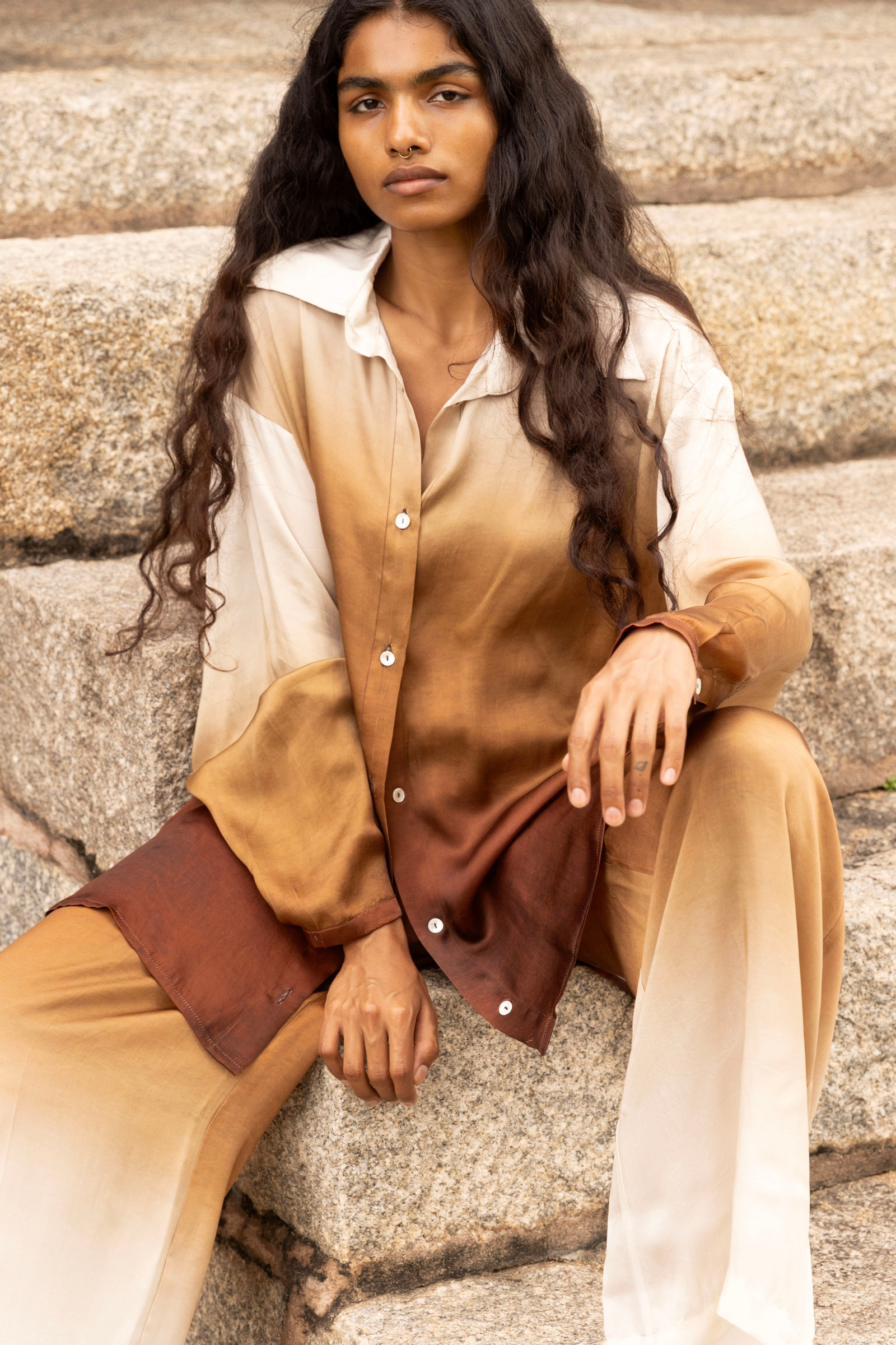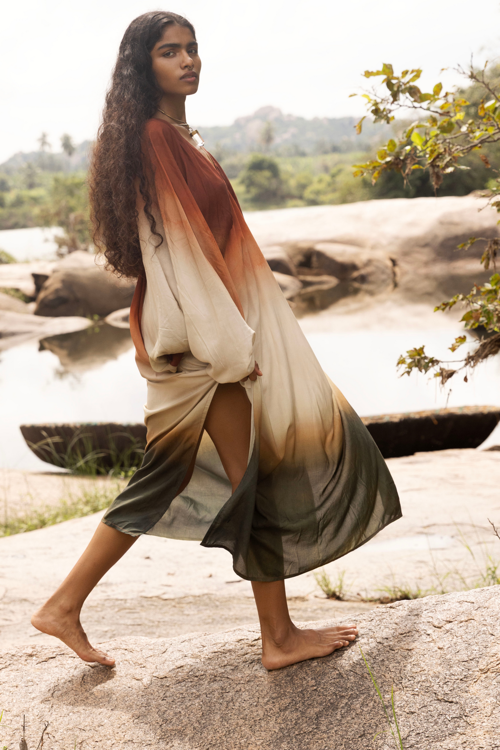 Crafted with intention, Nomadica embraces sustainability through the use of banana fabric and linen—materials chosen for their minimal environmental impact and natural elegance. Our collection's ombré hues and digitally printed designs not only capture the essence of shifting horizons but also signify a commitment to water conservation, reducing the need for traditional dyeing processes. In Nomadica, every stitch tells a story of conscious creation, where beauty and responsibility walk hand in hand.