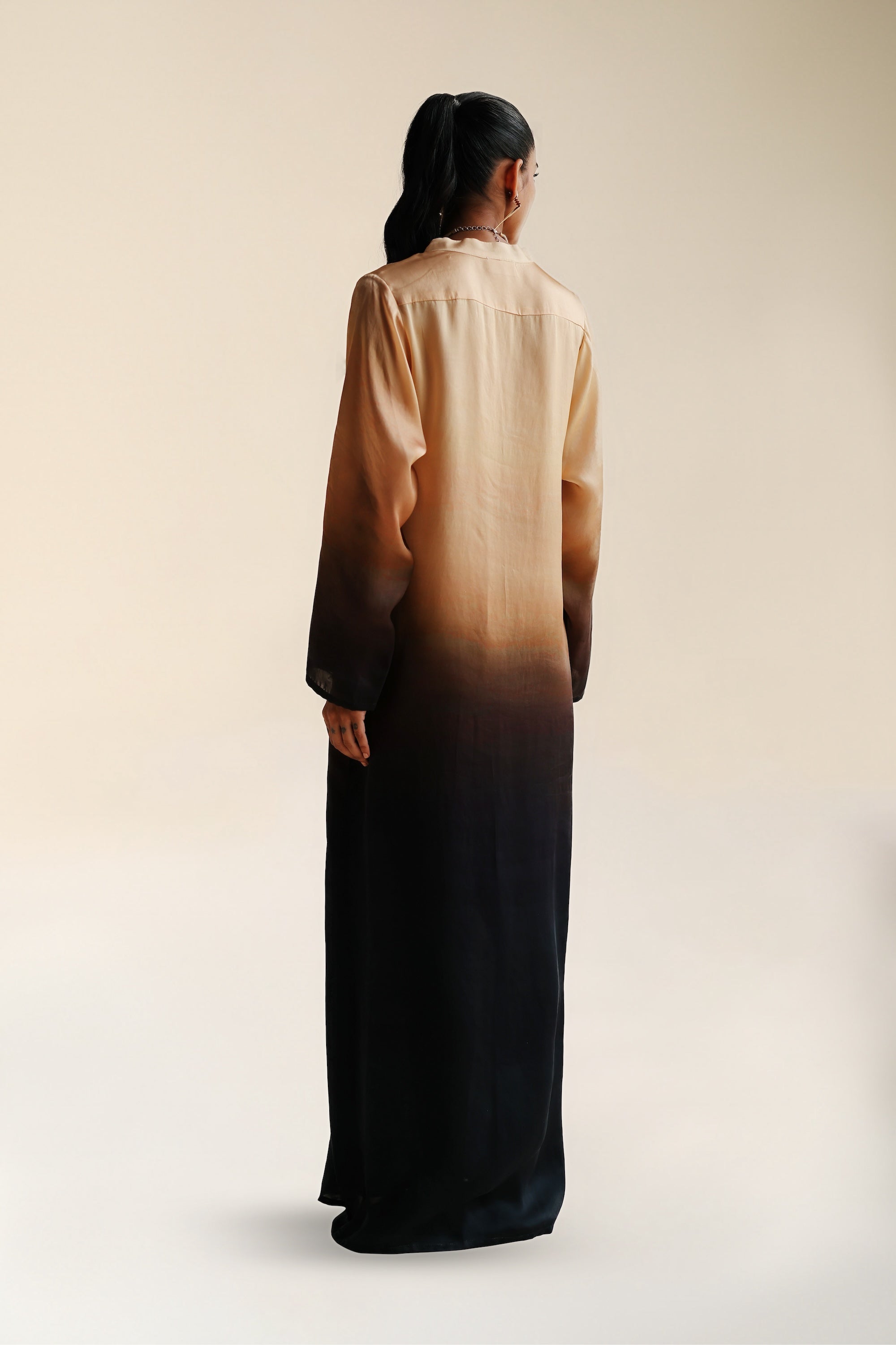 The Amara Dress is crafted from lustrous satin in a striking gold-to-black dip dye effect. The gradient is achieved through digital printing, a modern technique chosen for its ability to create rich, seamless colour transitions while significantly reducing water waste.
