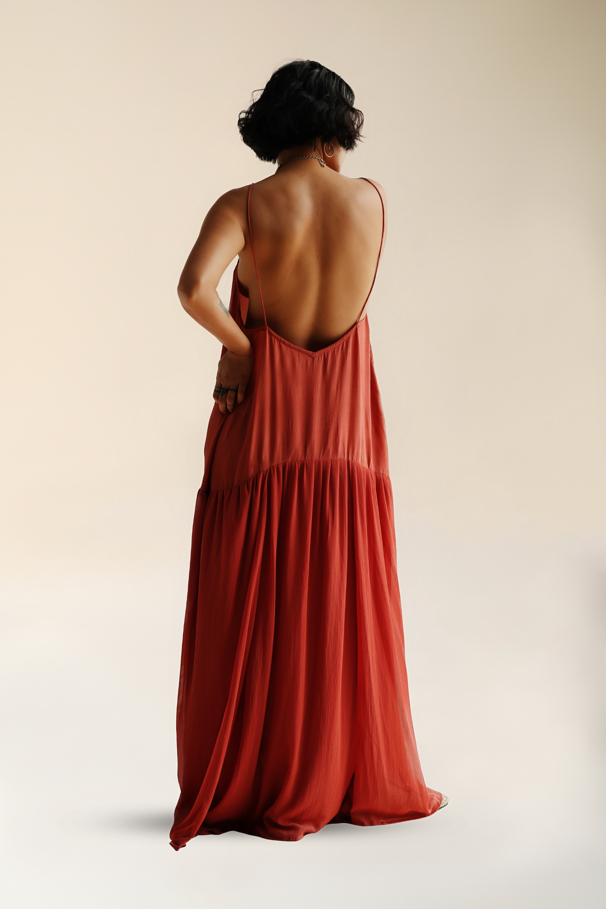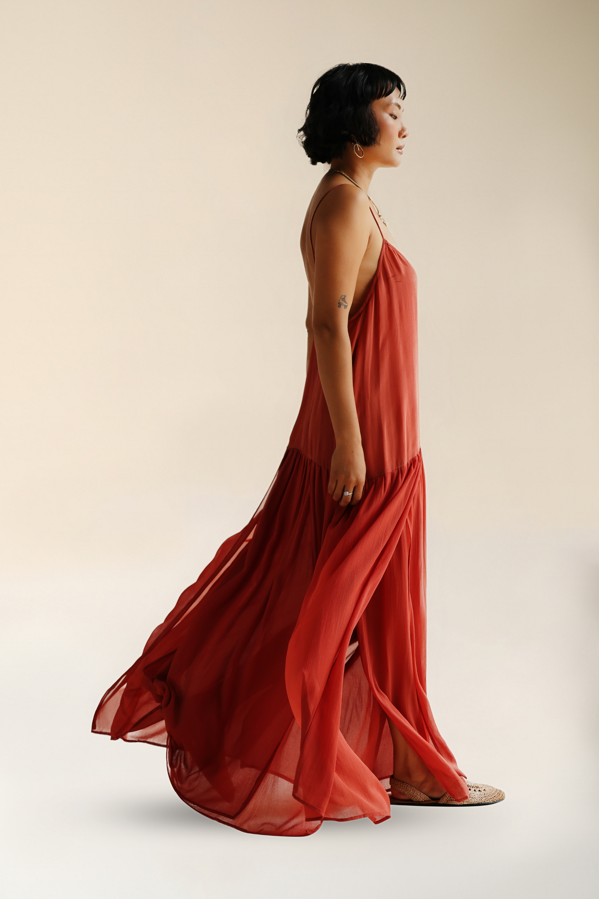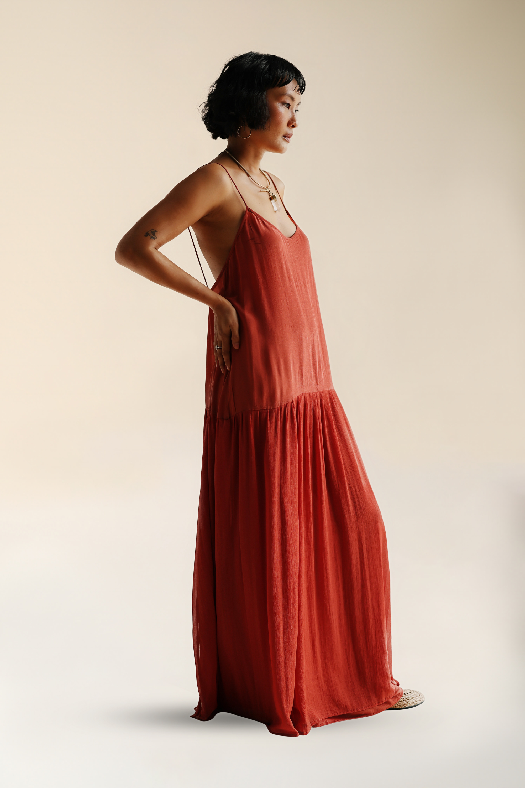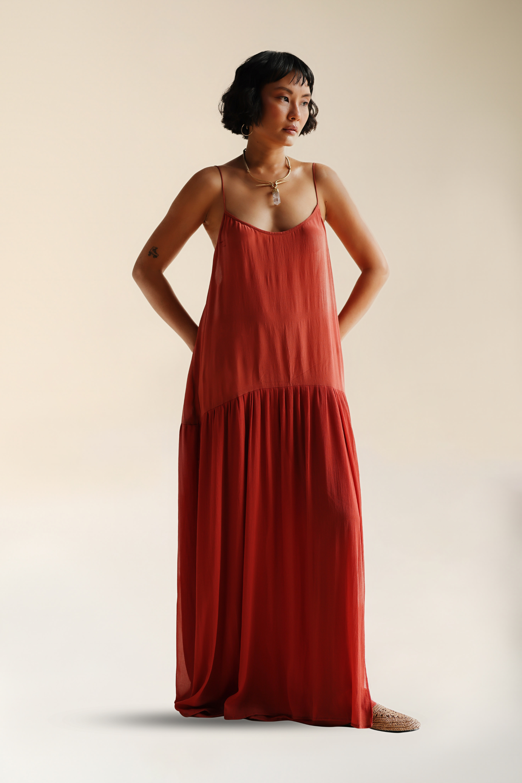 Shine bright in the Emerald Dress. A soft, textured silk crepe top meets sheer, sultry chiffon bottom. Delicate spaghetti straps frame the shoulders and lead into a softly draped bodice, skimming the skin with a barely-there feel. The silhouette drops into a low waist, where airy chiffon gathers and cascades to the floor, catching light and movement while you wander.