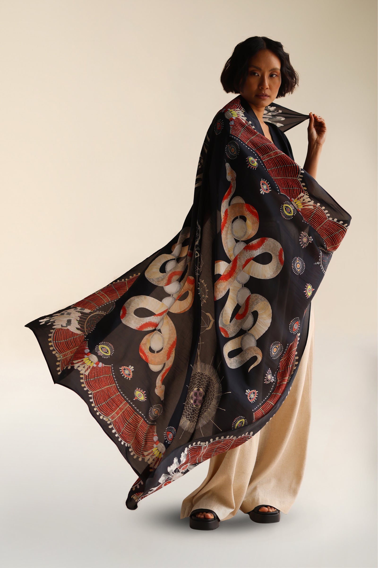 The Serpent Scarf delves into themes of personal metamorphosis. The serpent, a universal symbol of rebirth and transformation, is depicted alongside ancient Tantric Chakra motifs, serving as a map to our inner selves. The border draws inspiration from tribal beadwork necklaces of Nagaland in Northeast India, adding a touch of indigenous artistry.