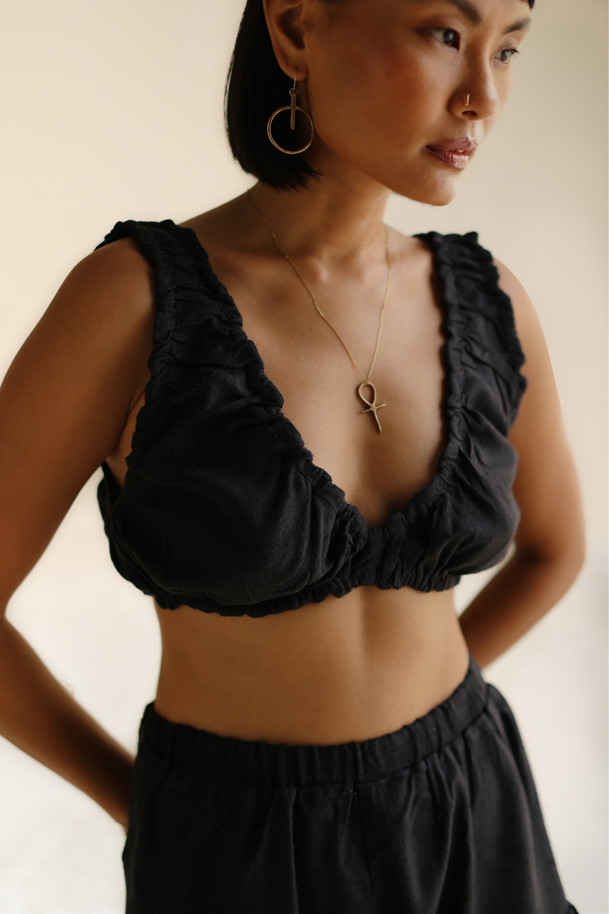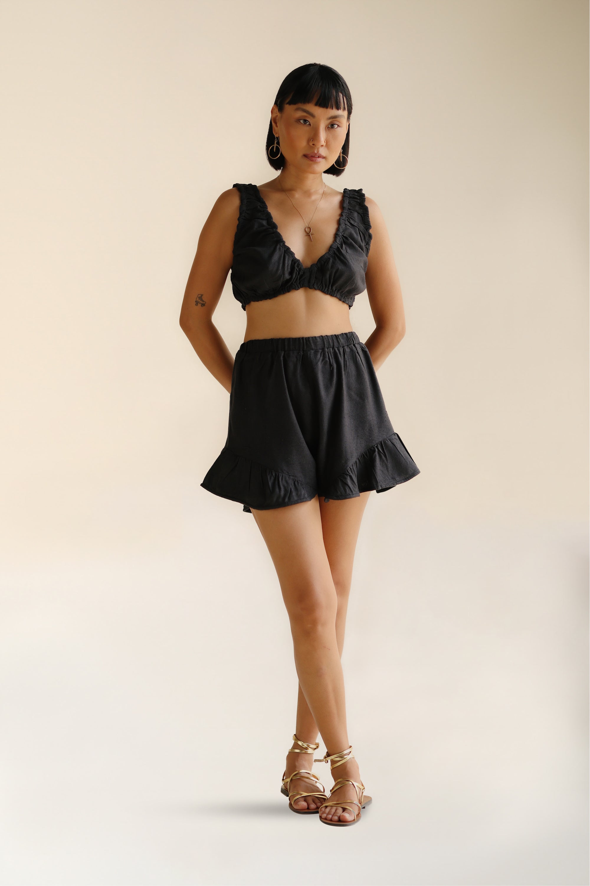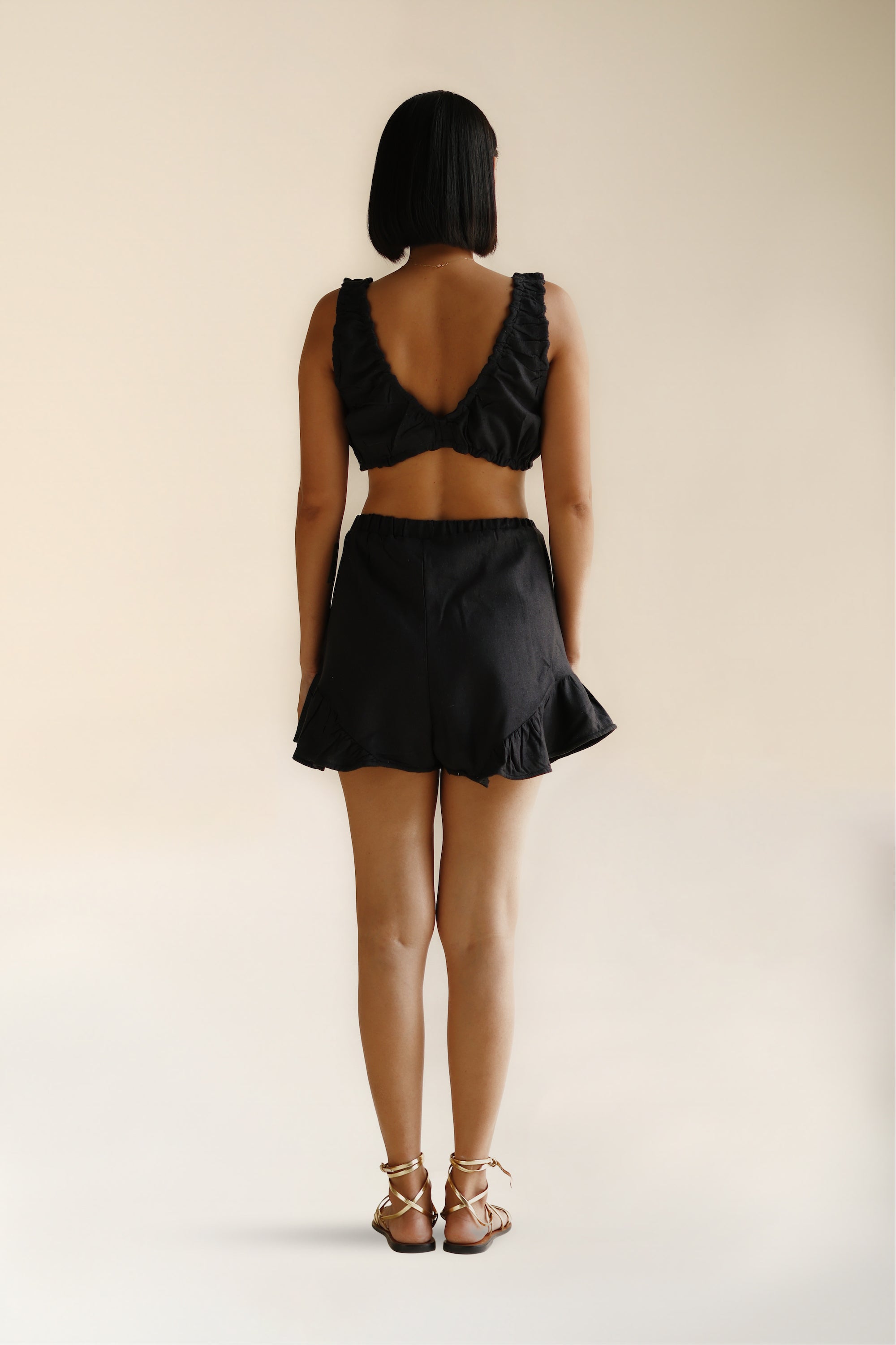 Introducing our revamped Lola Top, now crafted from a thicker-weave wild silk in a bold, all-black design. This luxe bra top features elasticated banding under the bust for a comfortable, secure fit, and the pretty seam detailing adds a playful twist. Make it a go-to for anything from lazy afternoons to after-dark adventures. Pair them with the matching Lola Shorts for the ultimate co-ord, or mix and match to suit your mood. Dress it up or down - the choice is yours.